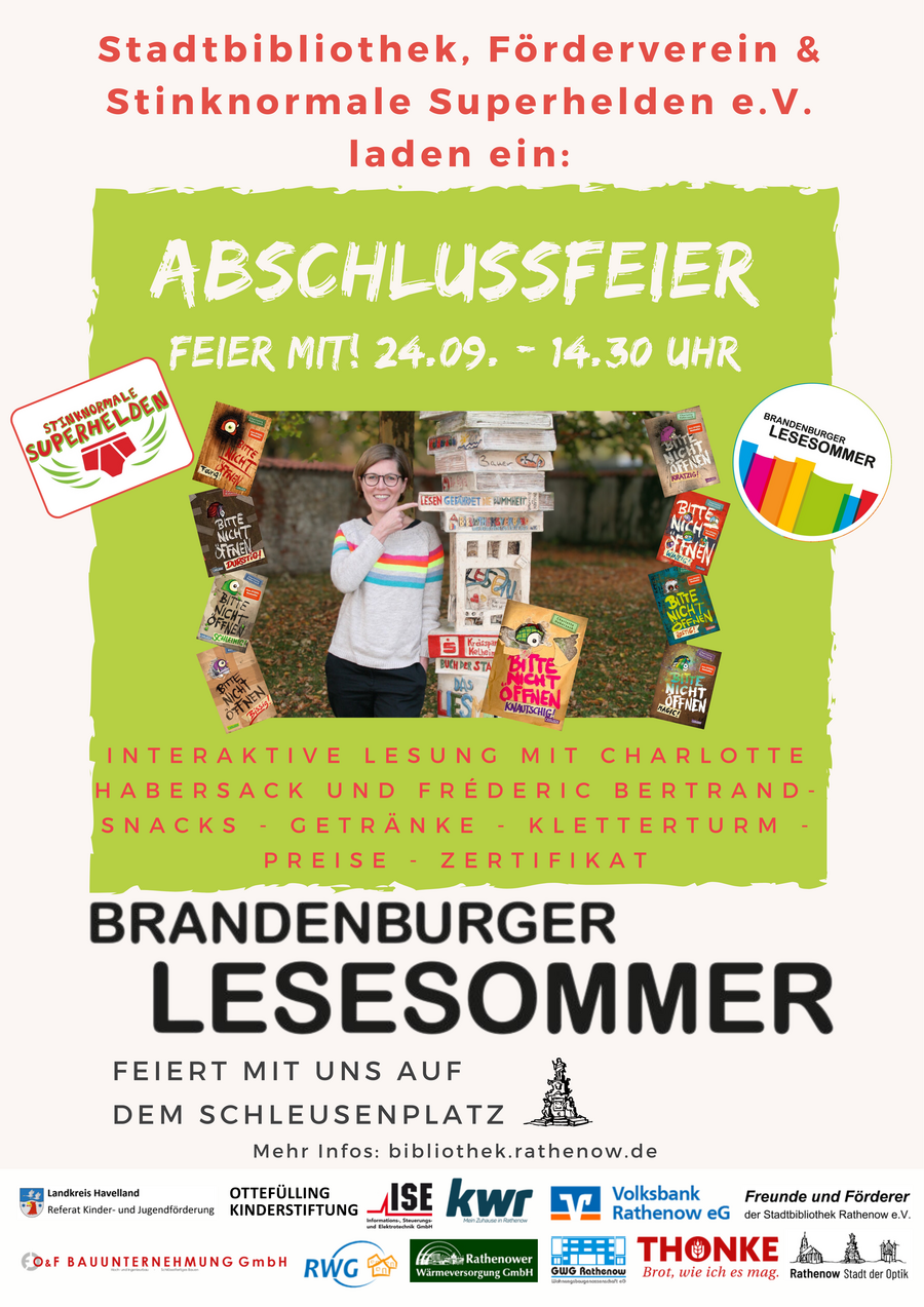 Die Abschlussfeier krönte dieses Rekordjahr durch die wunderbare Lesung der Jugensbuchautorin Charlotte Habersack. Im Kooperation mit den Stinknormalen Superhelden und durch die Unterstützung vieler lokaler Akteure wie dem Freizeithaus "Mühle", dem Jugendhaus "Oase", dem Kreissportbund Havelland, dem Albertinenhof und der Buchhandlung "Tieke" sowie mit finanzieller Unterstützung der Bürgerstiftung in der Region Rathenow konnte ein wunderschönes Fest gefeiert werden.
